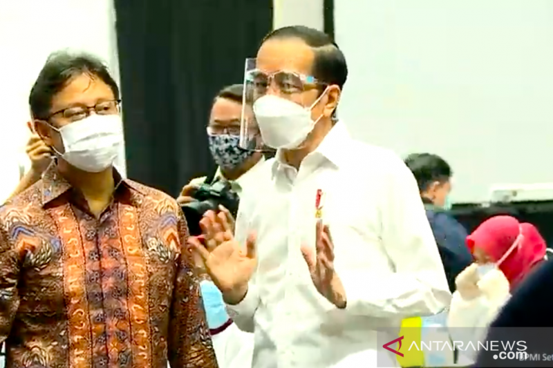Berdasarkan siaran video yang ditayangkan langsung oleh Sekretariat Presiden dipantau di Jakarta, Kamis, Presiden Jokowi didampingi Menteri Kesehatan Budi Gunadi Sadikin meninjau lokasi vaksinasi massal tenaga kesehatan di Gedung Istora Senayan, Jakarta.