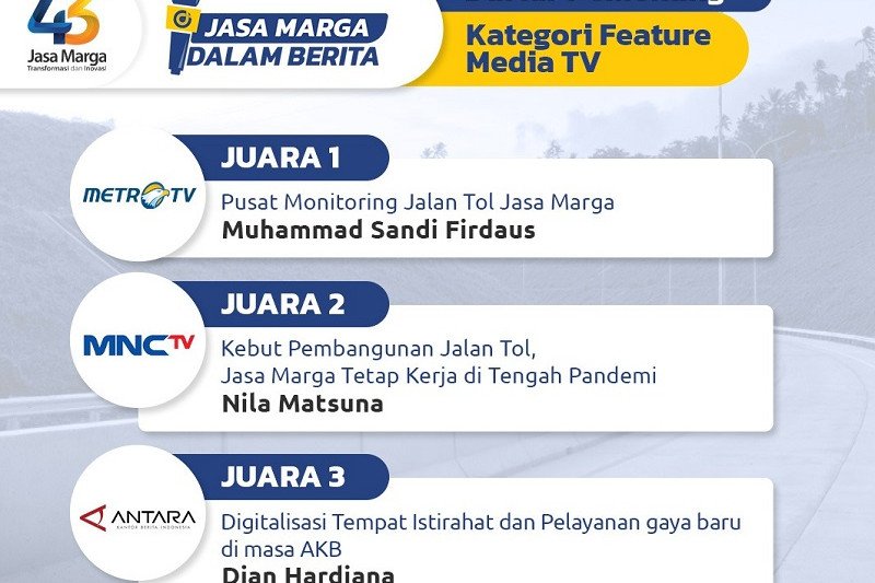 “Kami menerima banyak kiriman karya jurnalistik dari rekan-rekan pewarta, baik nasional maupun daerah, yang sangat antusias mengikuti kompetisi ini. Bahkan turut berlomba-lomba untuk meliput berbagai inovasi yang diluncurkan oleh Jasa Marga pada HUT Ke-43 di awal bulan ini, kami benar-benar bersyukur dan berterima kasih atas dukungan dari teman-teman media” ujar Heru dalam keterangan tertulis yang diterima di Jakarta, Sabtu.