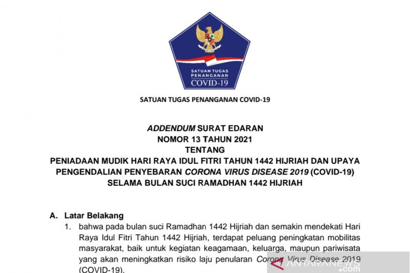 Aturan tersebut tertuang dalam Addendum Surat Edaran Nomor 13 Tahun 2021 tentang Peniadaan Mudik Hari Raya Idul Fitri dan Upaya Pengendalian Penyebaran COVID-19 selama Ramadhan yang ditandatangani Ketua Badan Nasional Penanggulangan Bencana (BNPB), Doni Monardo, pada 21 April 2021.
