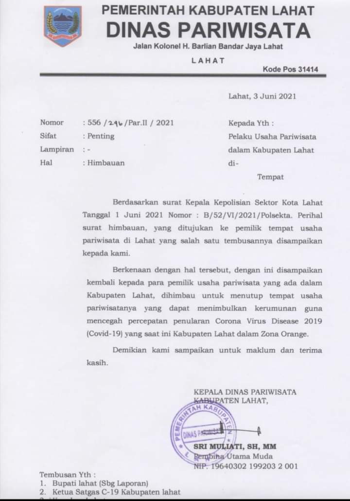 Demikianlah surat tersebut dibuat dan disampaikan kepada seluruh para pelaku Usaha Pariwisata yang ada di Kabupaten Lahat, dan ditanda tangani oleh Kepala Dinas Pariwisata Kabupaten Lahat, Sri Muliati SH MM. (Din)