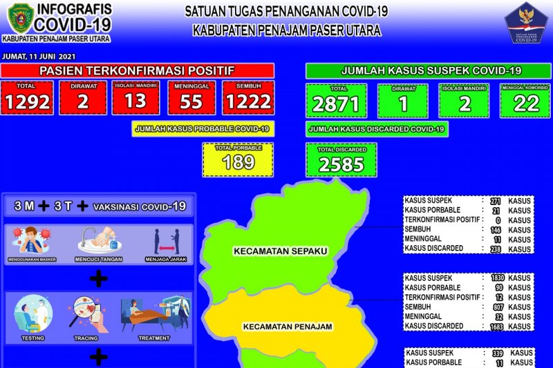 Jika dirinci perkembangan per kecamatan dari total positif yang sebanyak 1.292 orang tersebut, maka Kecamatan Penajam masih ada 12 orang positif, 807 orang sembuh, dan 32 orang meninggal, Kecamatan Waru sudah tidak ada yang positif, 153 orang dinyatakan selesai isolasi mandiri karena telah sembuh, dan empat orang meninggal, Kecamatan Babulu ada tiga orang yang positif, 116 orang sembuh, delapan orang meninggal, Kecamatan Sepaku tidak ada yang yang positif, 146 orang sembuh, dan 11 orang meninggal.(anjas)