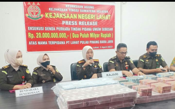 Lahat, jurnalsumatra.com – Kejaksaan Negeri (Kejari) Lahat menerima (Eksekusi) pembayaran denda senilai Rp.20 milyar atas terpidana PT Lematang Pulau Pinang Bara Jaya (LPPBJ). Acara penerimaan eksekusi denda PT LPPBJ tersebut, diterima oleh Kejari Lahat pada Selasa (05/04/2022) di kantor utama Bank BRI Cabang Lahat.