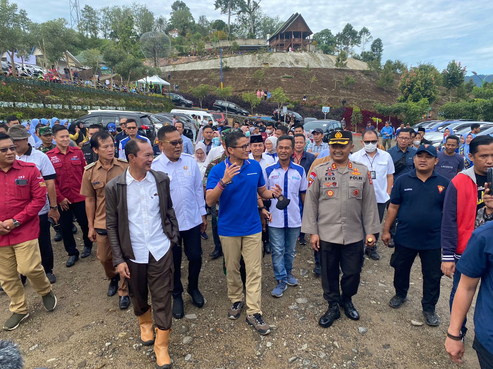 Lahat, jurnalsumatra.com – Bertempat dikecamatan Tanjung Sakti PUMI, Kabupaten Lahat Provinsi Sumatera Selatan (Sumsel), Kapolres Lahat AKBP Eko Sumaryanto SIK menyambut kedatangan Menteri Pariwisata dan Ekonomi Kreatif (Menparekraf) RI. Mantan wakil Gubernur Jakarta Salahuddin Sandiaga Uno ini, melakukan kunjungan ke-Kecamatan Tanjung Sakti PUMI, Kabupaten Lahat, para Menteri bersama rombongan tiba di Agrowisata Sindang Panjang sekitar pukul 09.00 WIB.