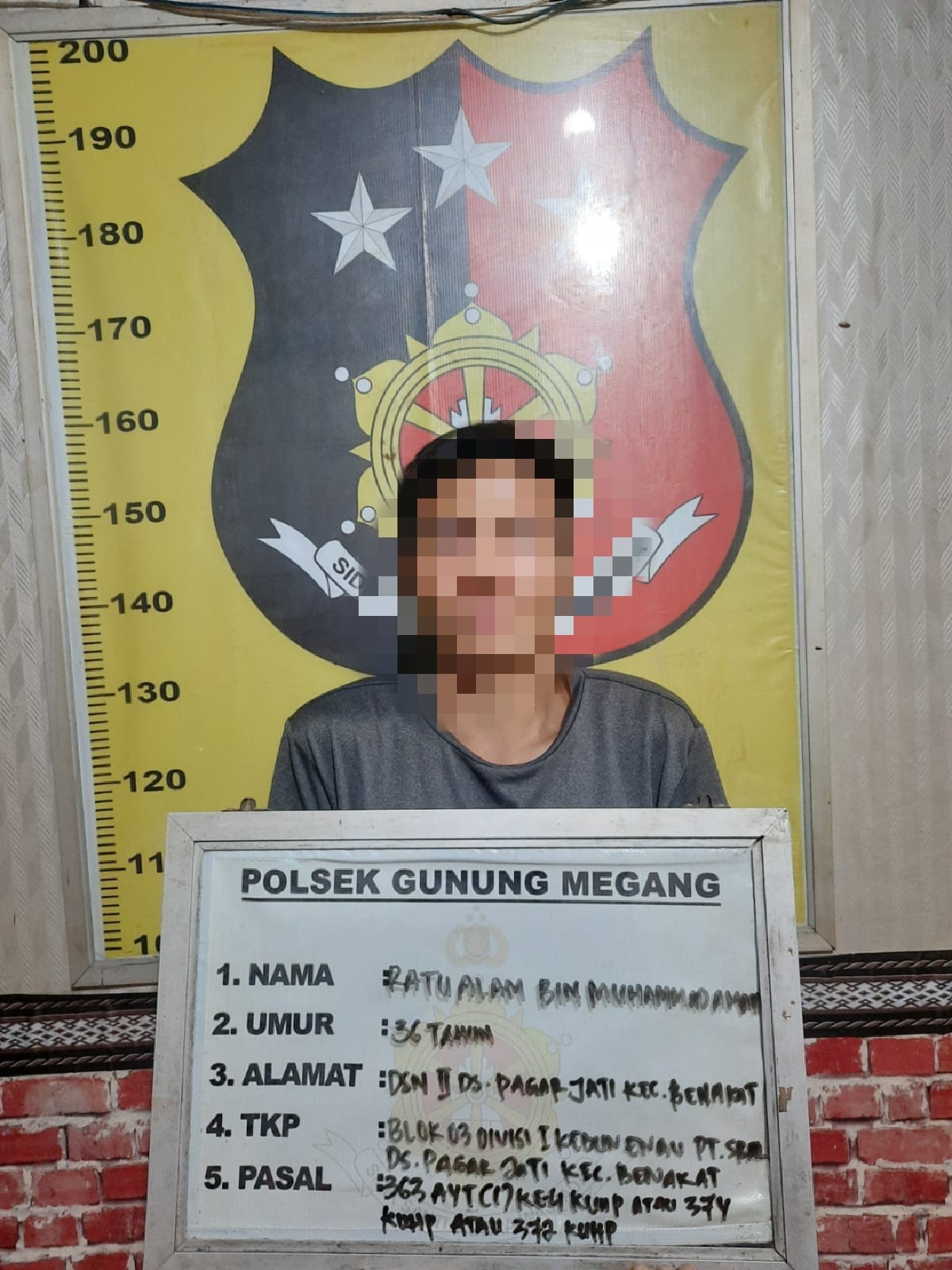 Polisi menjebloskan tersangka kedalam jeruji besi, setelah menerima Laporan Polisi No. Pol : LP / B / 15 / III / 2022 / SUMSEL / RES. MA. ENIM / SEK. GN. MEGANG, tanggal 29 Maret 2022, waktu kejadian sekira jam 17.00 WIB, dengan TKP di Blok 03 Devisi I kebun enau PT SURYA BUMI AGRO LANGGENG Desa Pagar Jati kecamatan Benakat Kabupaten Muara Enim.