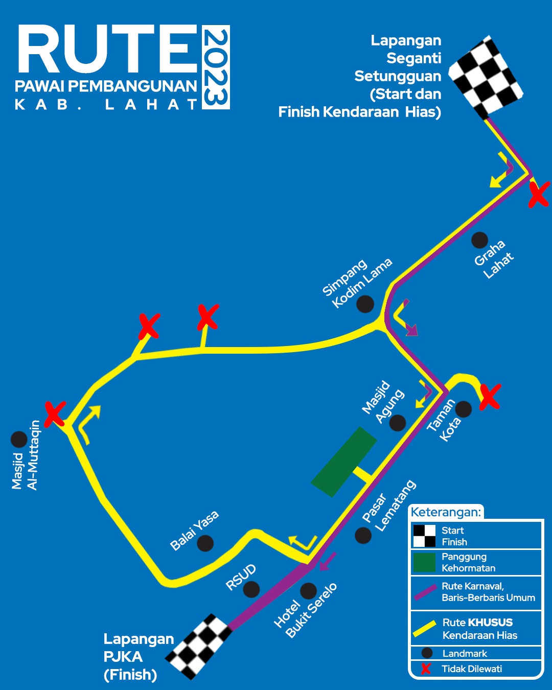Kemeriahan dalam rangka HUT RI ke-78 tahun 2023, yang digelar setiap tahun oleh Pemkab Lahat ini, bukan hanya merubah “Rute Pawai Pembangunan” saja juga sedikit menghambat lajunya para pengendara. Karena, Pemerintah Kabupaten Lahat akan “Menutup Jalan di Empat Titik”. Kepala Dinas Perhubungan (Dishub) Kabupaten Lahat, Drs. Deswan Irsyad MPdi didampingi Kabid Lalulintas Andri Y SE mengakui, bahwa untuk Rute Pawai Pembangunan Lahat mengalami perubahan.