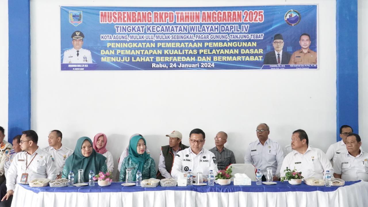 Musrenbang dengan tema “Peningkatan Pemerataan Pembangunan dan Pelayanan Dasar Pemantapan Kualitas Menuju Lahat Berfaedah” dilaksanakan di ruang Aula kecamatan Kota Agung, Lahat, pada Rabu (24/1/2024).
