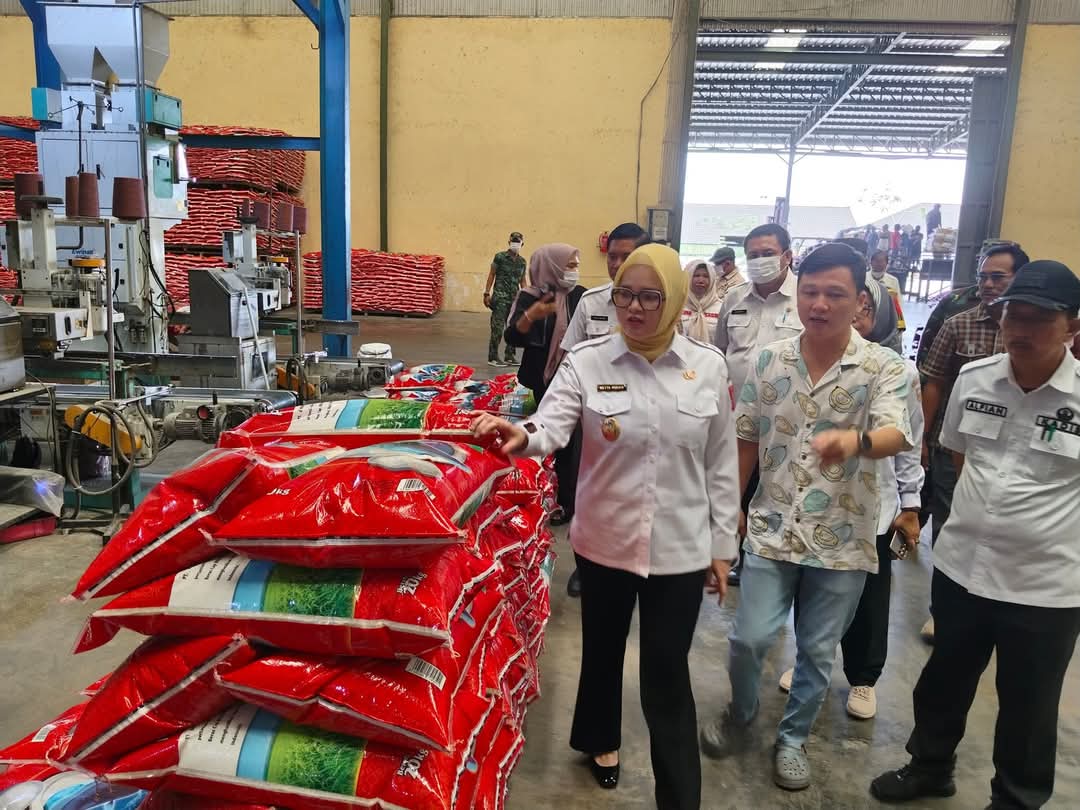 Didampingi oleh Tim Pengendalian Inflasi Daerah (TPID), Plt. Asisten II Setda Banyuasin, Ir. Zakirin, SP., MM.,CGCAE, Kepala Dinas Perindag-UKM Banyuasin, Ir. Alpian Soleh, MM, Kadis Ketahanan Pangan Banyuasin, Masita Liana, SP, dan Camat Talang Kelapa, Salinan, S. Sos., M. Si, Wabup Netta melihat ketersediaan, proses distribusi dan proses produksi beras, Rabu (26/03/2025).
