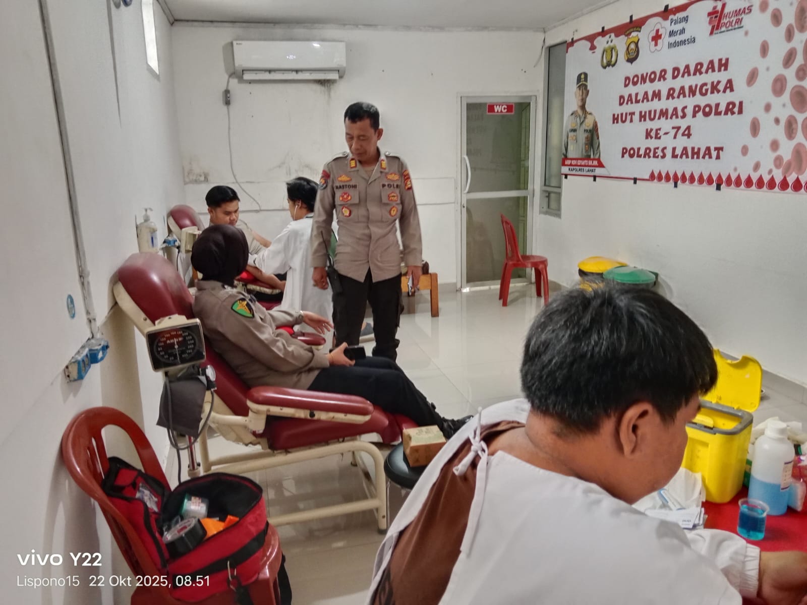 Dalam peringatan HUT Humas Polri ke-74 tersebut, Polres Lahat selenggarakan kegiatan donor darah sebagai bentuk kepedulian terhadap sesama, yang juga salah satu rangkaian berbagai program sosial yang digelar oleh Humas Polri.