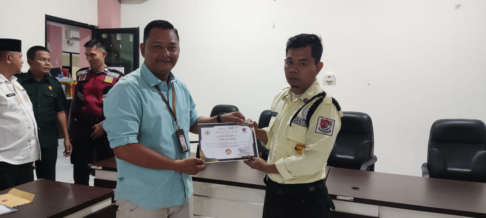 Piagam penghargaan dan dana motivasi diserahkan secara langsung oleh kepala cabang PT.GCB ,Riko Dt.Marido kepada 4 Satpam yang hadir dalam pertemuan khusus di aula RSUD Lubukbasung, yang disaksikan Kepala Tata Usaha RSUD Lubuk Basung Arno, Aiptu Syafruddin dari Sabhara Polres Agam, Yusfikal Danru Satpam RSUD Lubukbasung dan staf PT.GCB. (Ron)